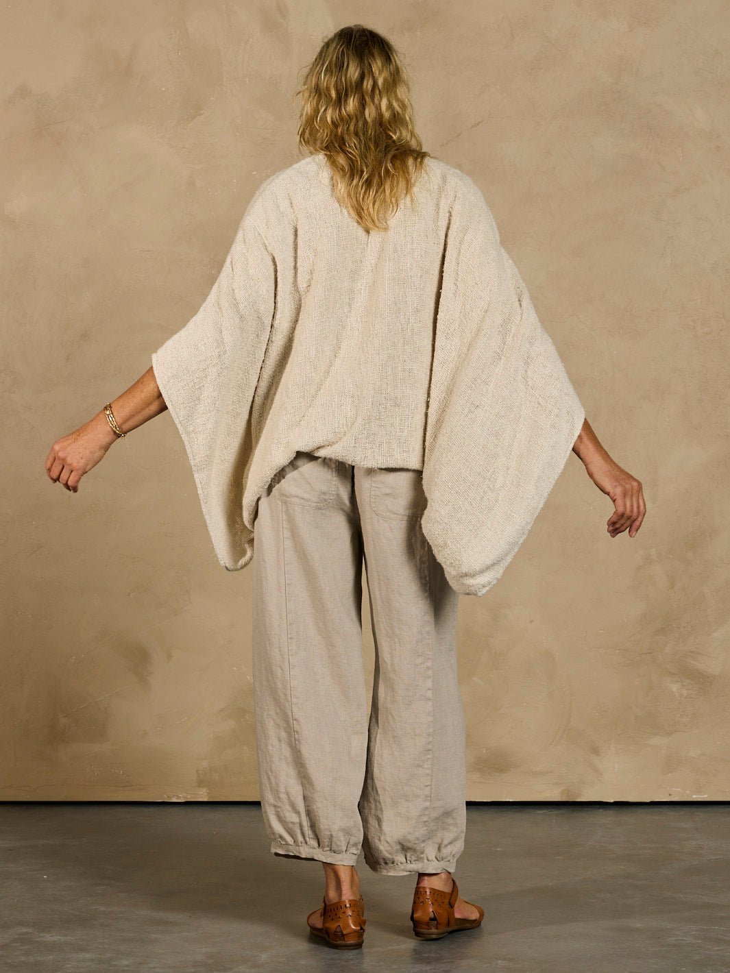 Crafted from 100% textured raw cotton on a traditional handloom. the Bloom Shrug features a soft. breathable heavyweight open-slub weave with the perfect balance of warmth and airflow. Its relaxed silhouette and flowing kimono sleeves drape gracefully. designed to be worn open for effortless. timeless style—an elegant layering piece for every season.
