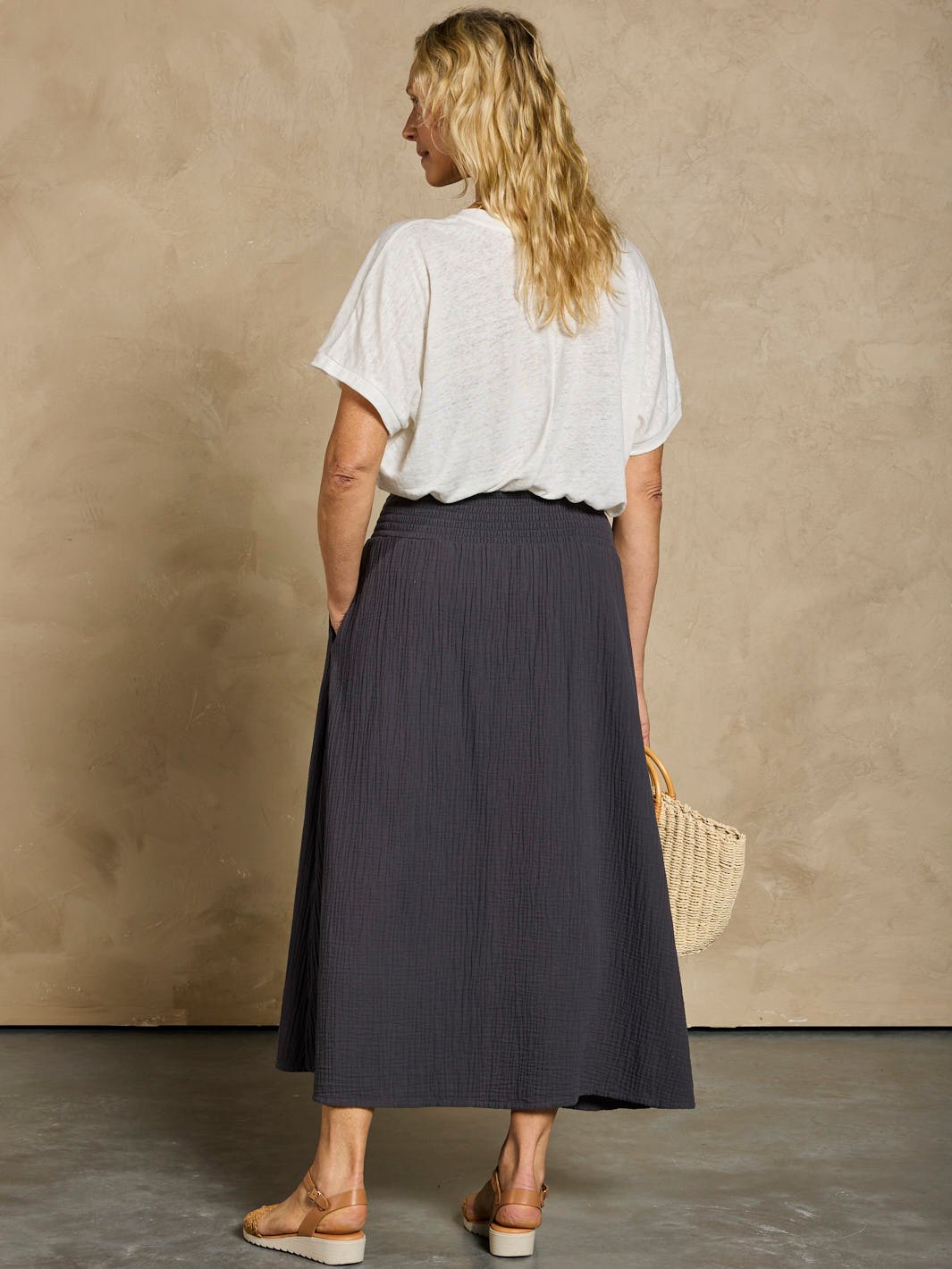The Chania Skirt is crafted from incredibly soft. natural cotton gauze that flatters the figure with a forgiving A-line silhouette. A fully smocked waistband adds flexibility and all-day comfort. making it easy to slip on and feel good. Light. airy. and made to move with you. it’s the perfect companion for travel. relaxed days. and rediscovering effortless style.