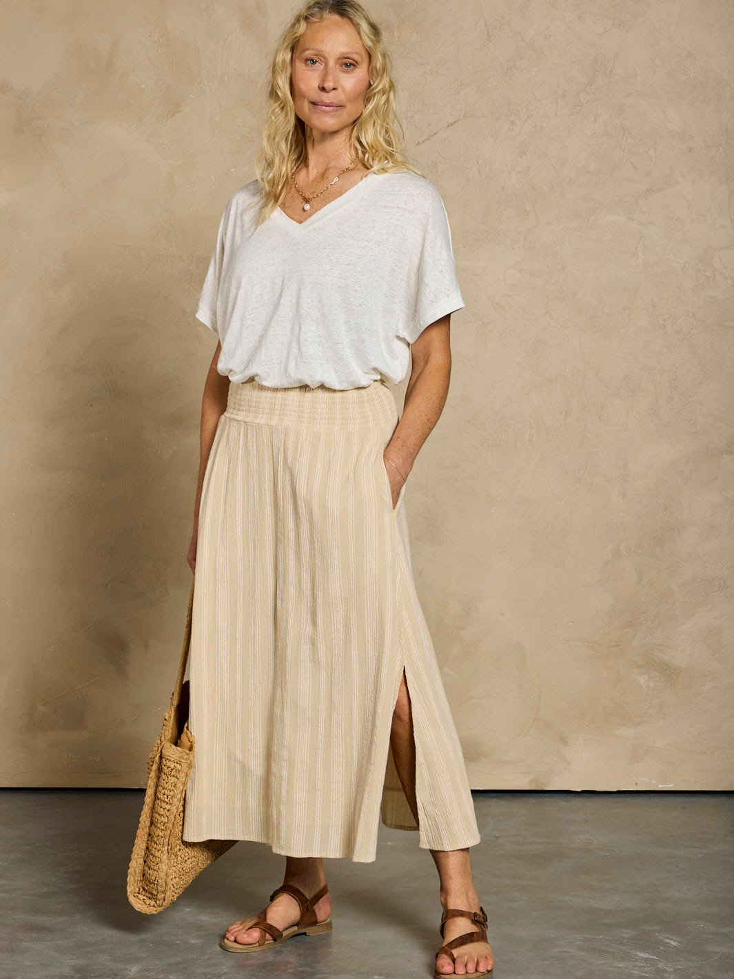 The Chania Skirt is crafted from incredibly soft. natural cotton gauze that flatters the figure with a forgiving A-line silhouette. A fully smocked waistband adds flexibility and all-day comfort. making it easy to slip on and feel good. Light. airy. and made to move with you. it’s the perfect companion for travel. relaxed days. and rediscovering effortless style.