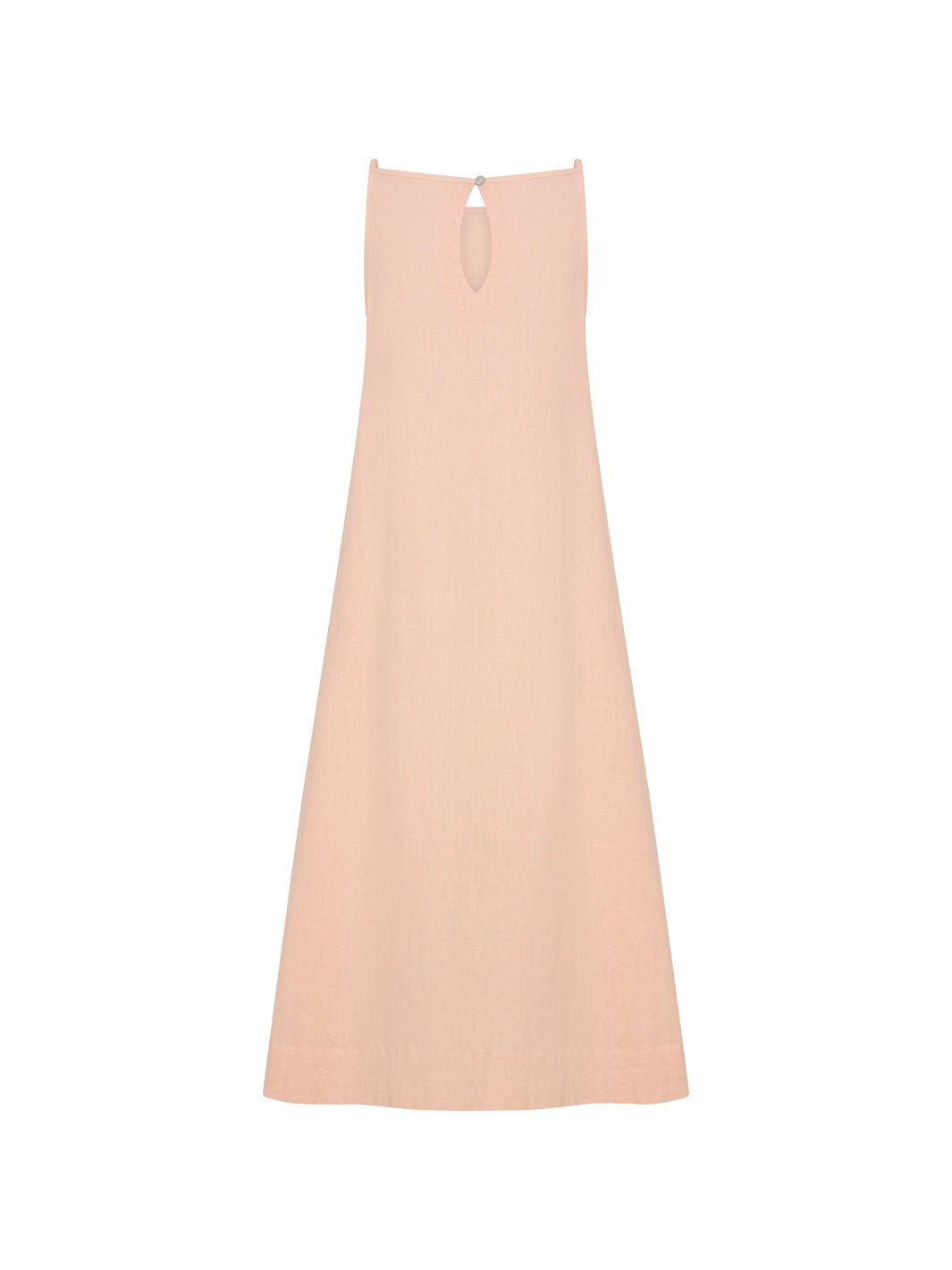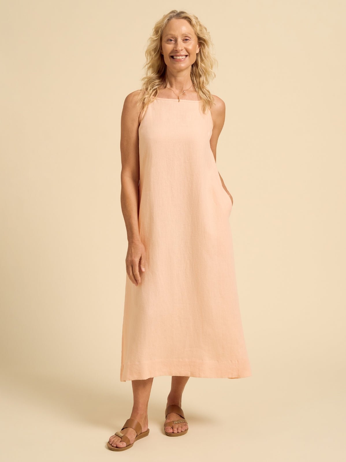 Crafted from 100% OEKO-TEX® STANDARD 100 French Linen. this dress offers a soft. breathable texture that keeps you cool and comfortable. With a flattering midi length. A-line silhouette. and high scoop neckline. it provides a relaxed yet refined fit. The Peony dress is your perfect go-to piece for autumn. blending versatility with effortless poise as the days grow cooler.